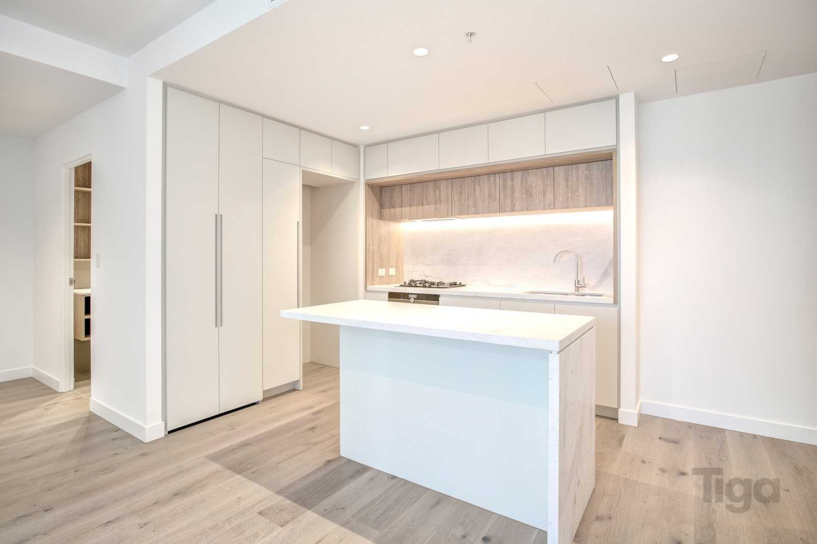 • Gourmet kitchen equipped with European appliances, stone benchtops, and splashback with ample storage cabinets